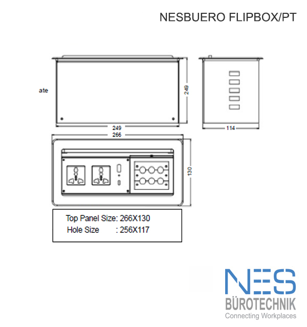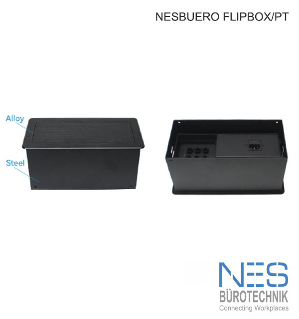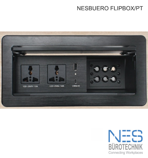 NES FlipBox/PT. Brushed, Anodized Alumnium designed Cable Cubby. Ergo Pull Opening System, Easy Connection Port for: IPhones, USB, Notebooks to projectors or TV screens in Conference Rooms, Hotel rooms, Meeting areas, Offices. The versatile Ergonomic Cable Cubby System by NES.