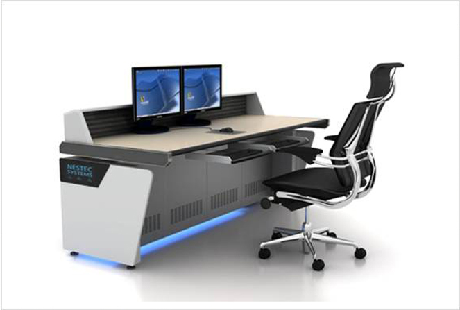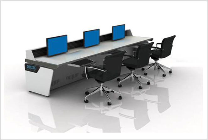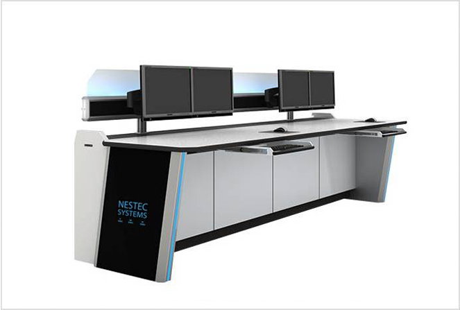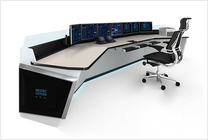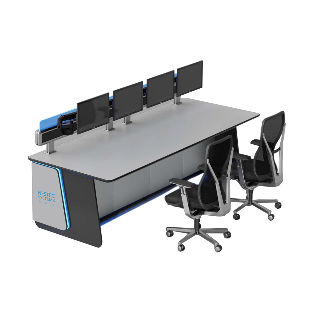 Bei der NK24-Serie handelt es sich um ein ergonomisch optimiertes Steuerpult-Tischsystem. Der Kontrollraumtisch besteht aus eloxierten Aluminiumkomponenten. NESTEC-Steuerkonsolen berücksichtigen alle Aspekte der Ergonomie (ISO-Standard) und des Kabelmanagements, einschließlich PDU, Belüftungssystem und NES ERGO-Monitorhalterungssystemen.