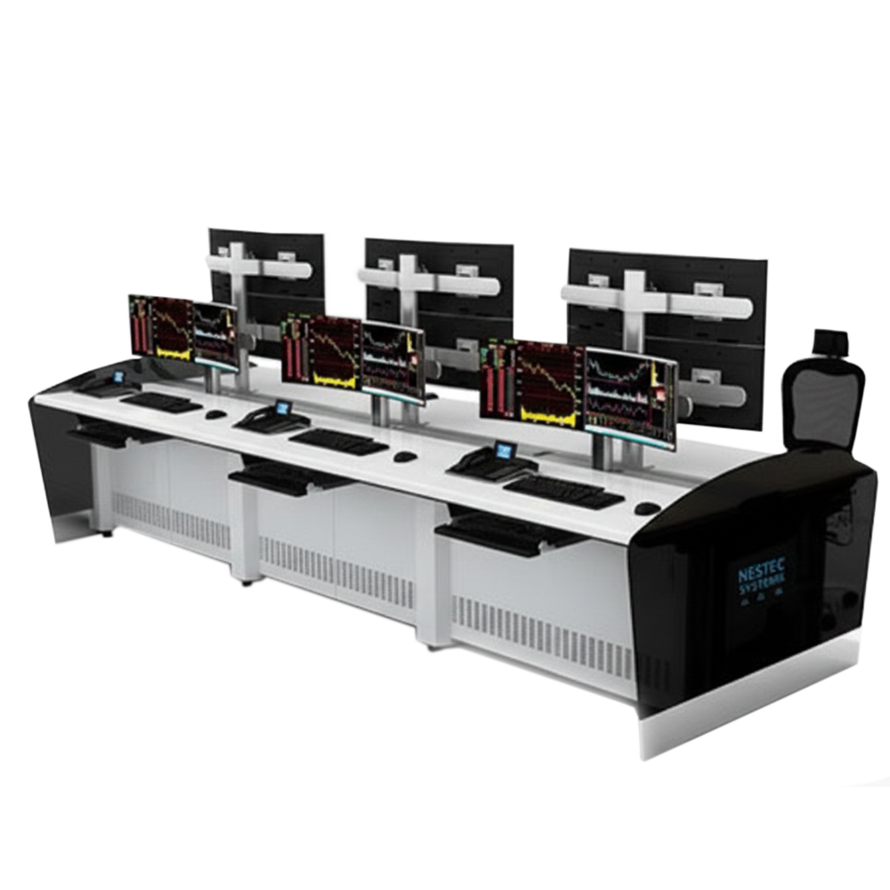 NESTEC-Leitstand Konsolen berücksichtigen alle Aspekte der Ergonomie (ISO Standard). Das Kabelmanagement, incl. PDU, aktive und passive Lüftungssysteme , sowie NES ERGO Monitorhalter-Systeme sind modular integriert.